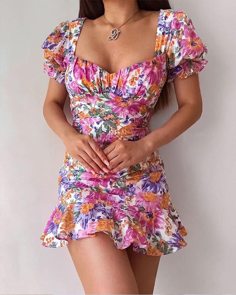Floral Print Ruffle Hem Ruched Mini Dress, Pink