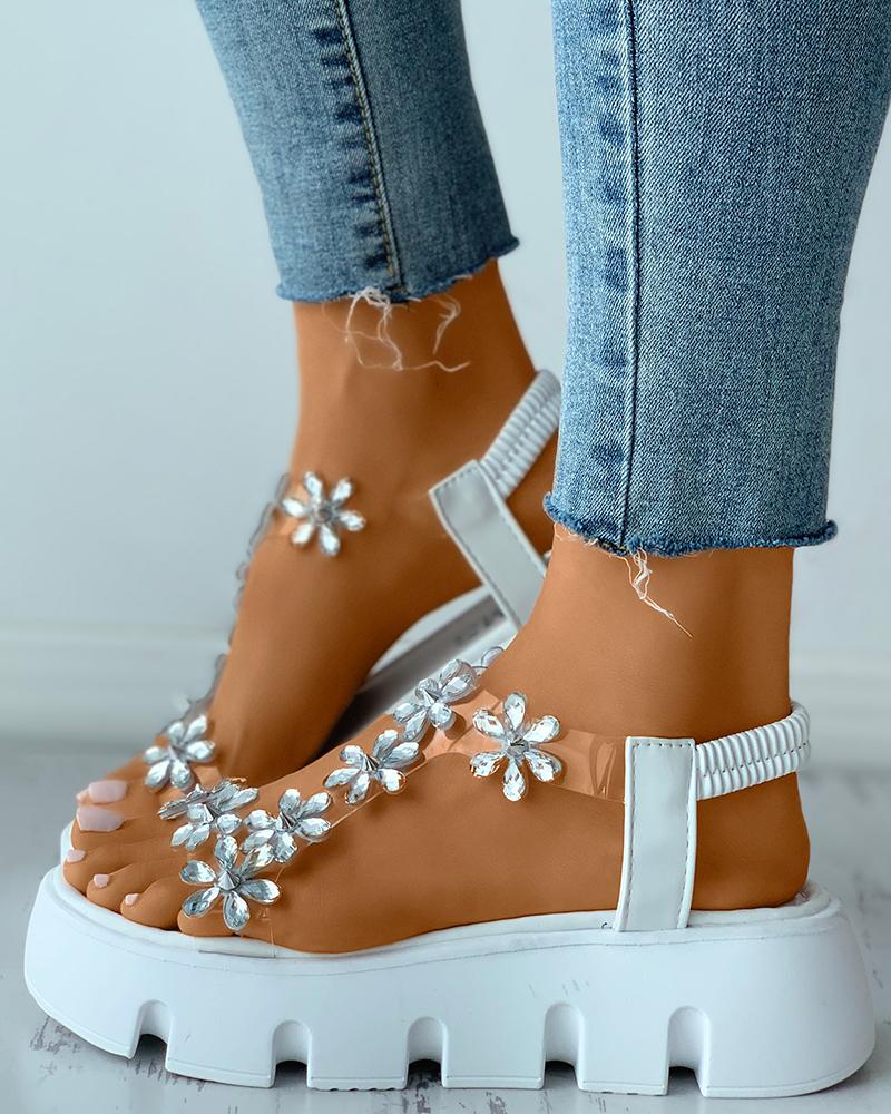 Floral Rhinestone Clear Perspex Flatform Sandals, White