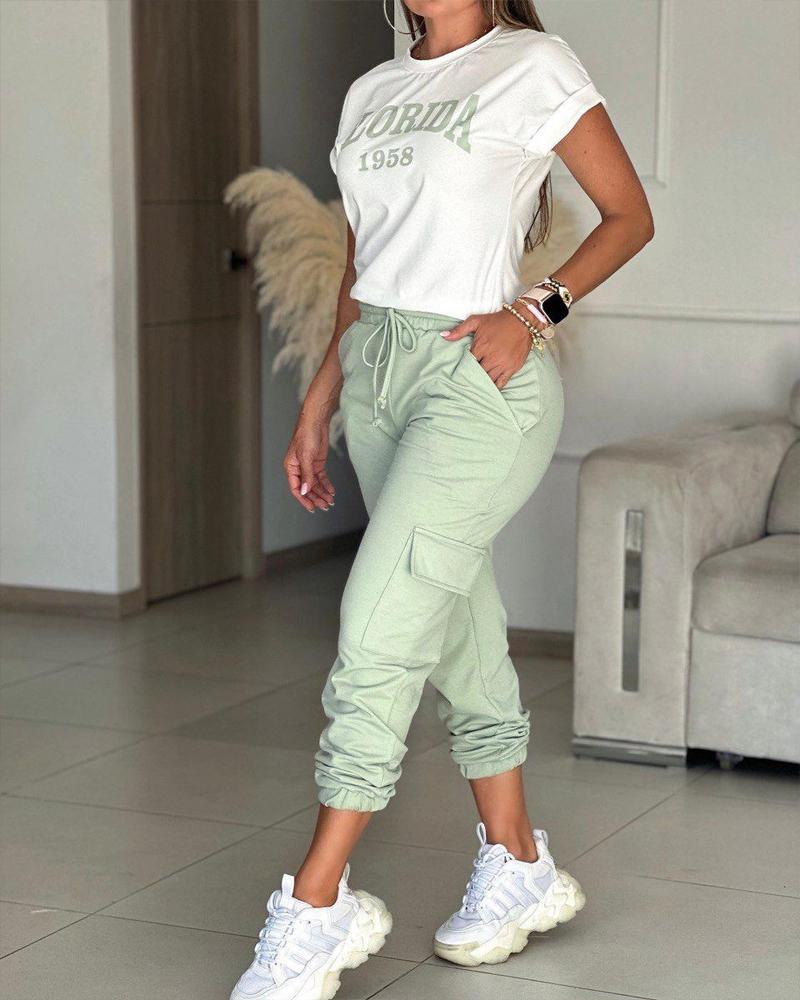 Florida 1958 Print Top & Drawstring Cuffed Pants Set, Green