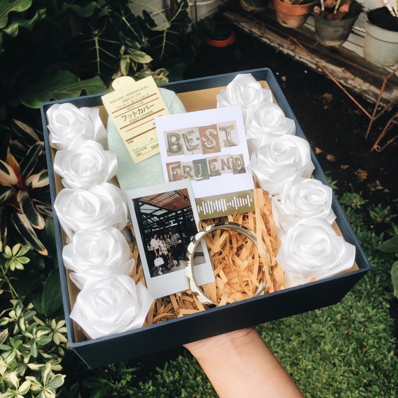 Harga di bawah adalah harga box + bunga satin (8pcs/mengisi seluruh box) sudah termasuk pita diluar box dan kartu ucapan.