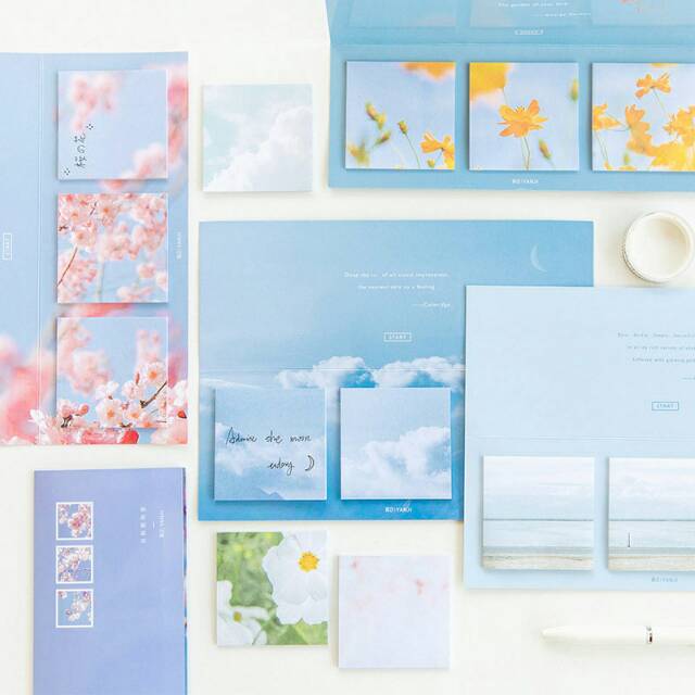 Warna biru langit dan pink menghiasi sticky notes bertema bunga dan awan ini. Hadir dalam bentuk brosur yang praktis, tiap varian catatan tempel ini berisi 3 desain berbeda agar kamu tidak bosan menggunakannya.