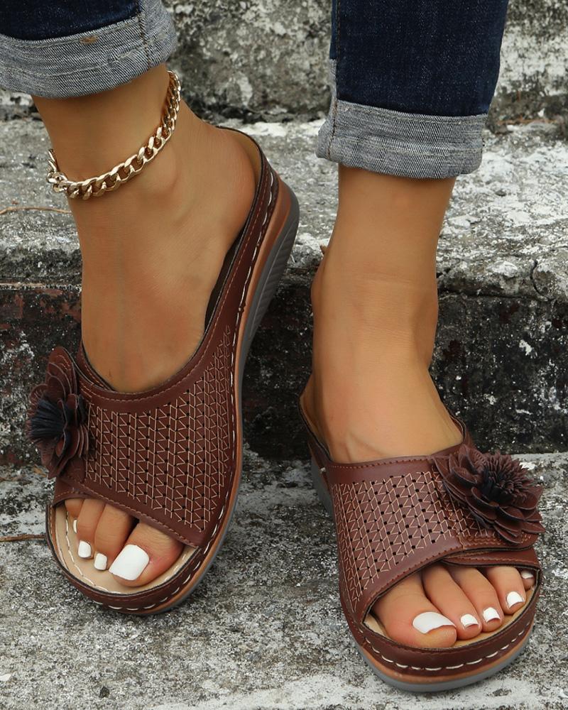 Flower Pattern Hollow Out Wedge Slippers, Coffee