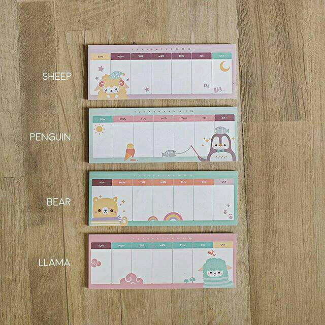 Rencanakan harimu dengan baik, ditemani oleh empat binatang lucu berbulu empuk. Dengan ukuran yang praktis, memo ini cocok juga digunakan sebagai reminder dan atau todo list. Berisi 30 lembar untuk 30 minggu.