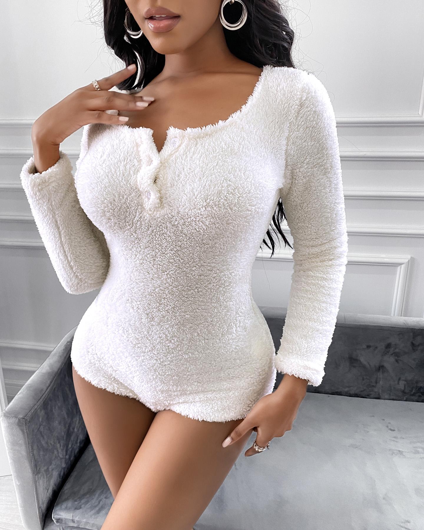 Fluffy Button Design Long Sleeve Romper, White
