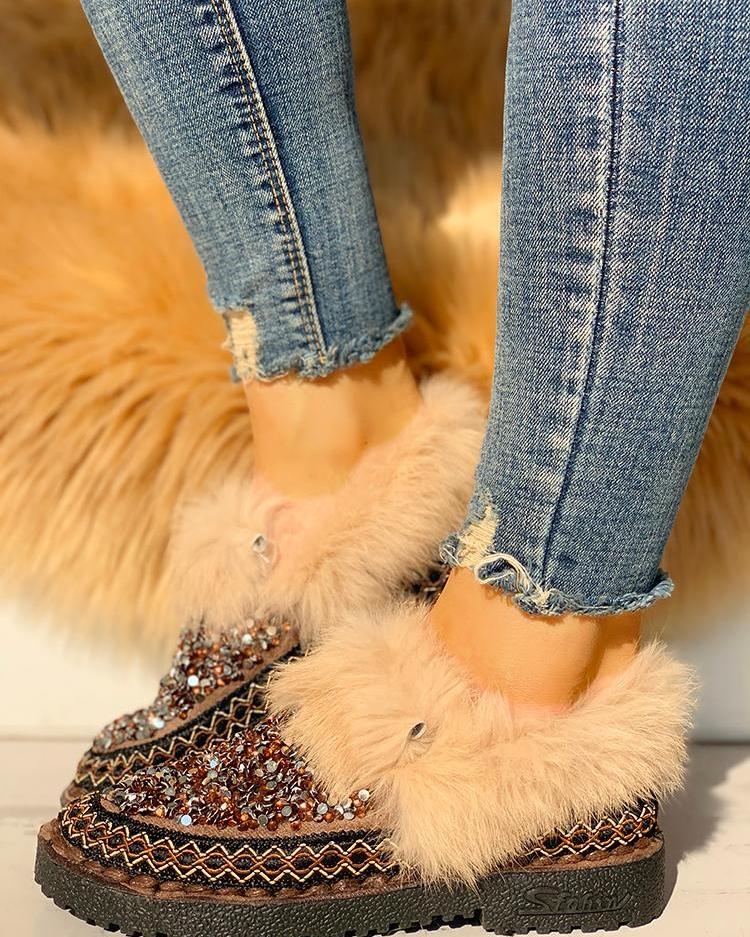 Fluffy & Rhinestone Embellished Flat Shoes