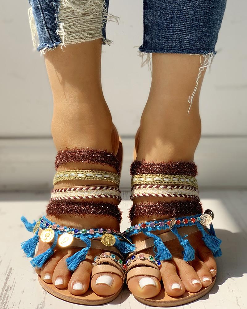 Fluffy Studded Tassel Design Toe Ring Sandals, Blue