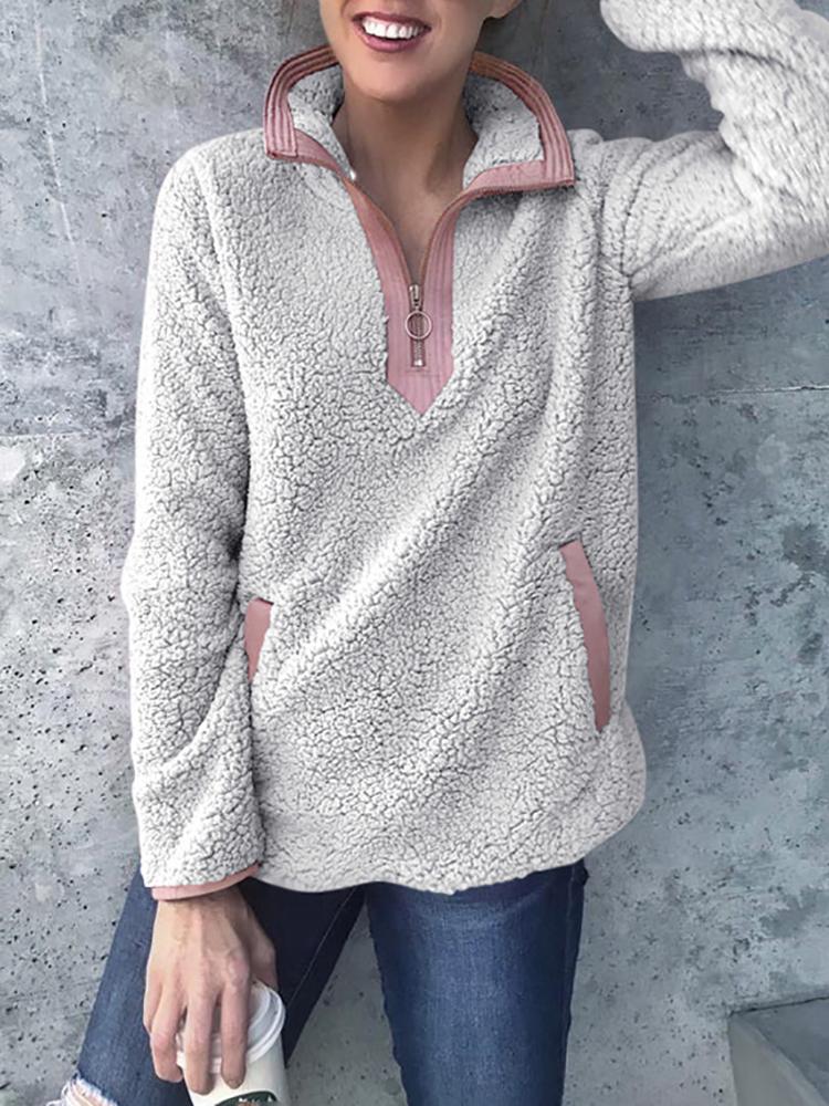 Fluffy Zipper Design Pocket Sweatershirt, Gray