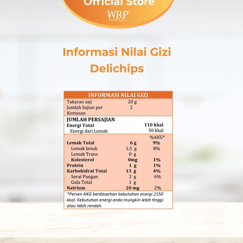 WRP Delichips adalah snack sehat pertama yang memadukan 5 kombinasi umbian dalam 1 kemasan yang di proses tanpa MSG, penguat rasa, serta 5 pilihan umbi pilihan yang diseleksi secara ketat dan di peroleh langsung dari petani lokal berkualitas.