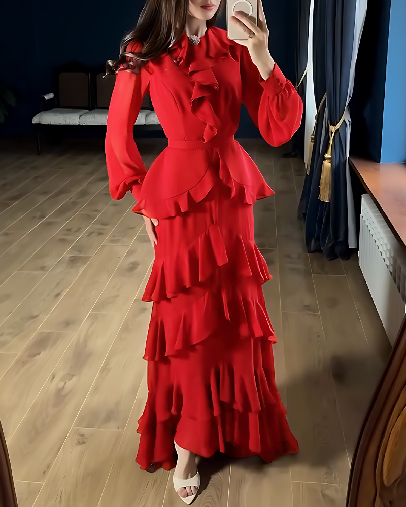 Layered ruffle trim – Cascading ruffles from neckline to hem create rich visual texture and soft, flowing movement.