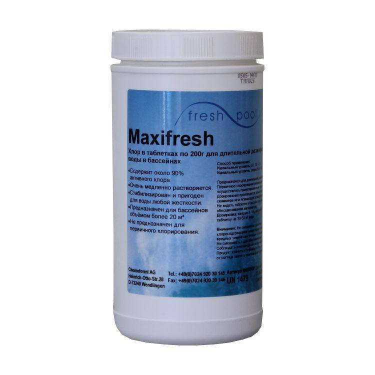 Fresh Pool Maxifresh 200 - хлорсодержащий препарат для длительной дезинфекции в виде больших таблеток по 200 грамм. Препарат эффективен против вирусов, бактерий, грибка, плесени, разрушает растворенные в воде взвеси, благодаря чему вода становится чище и прозрачней. Обладает длительным действием и растворяется в течение 7-10 дней.
