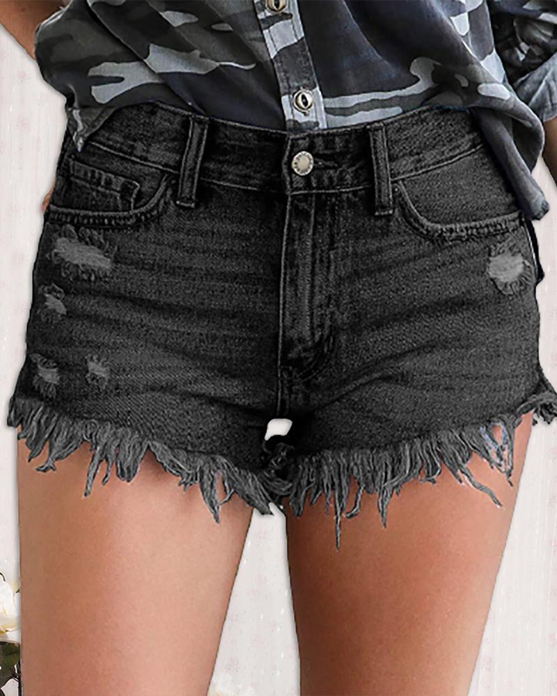 Fringe Hem Ripped Button Design Denim Shorts, Black