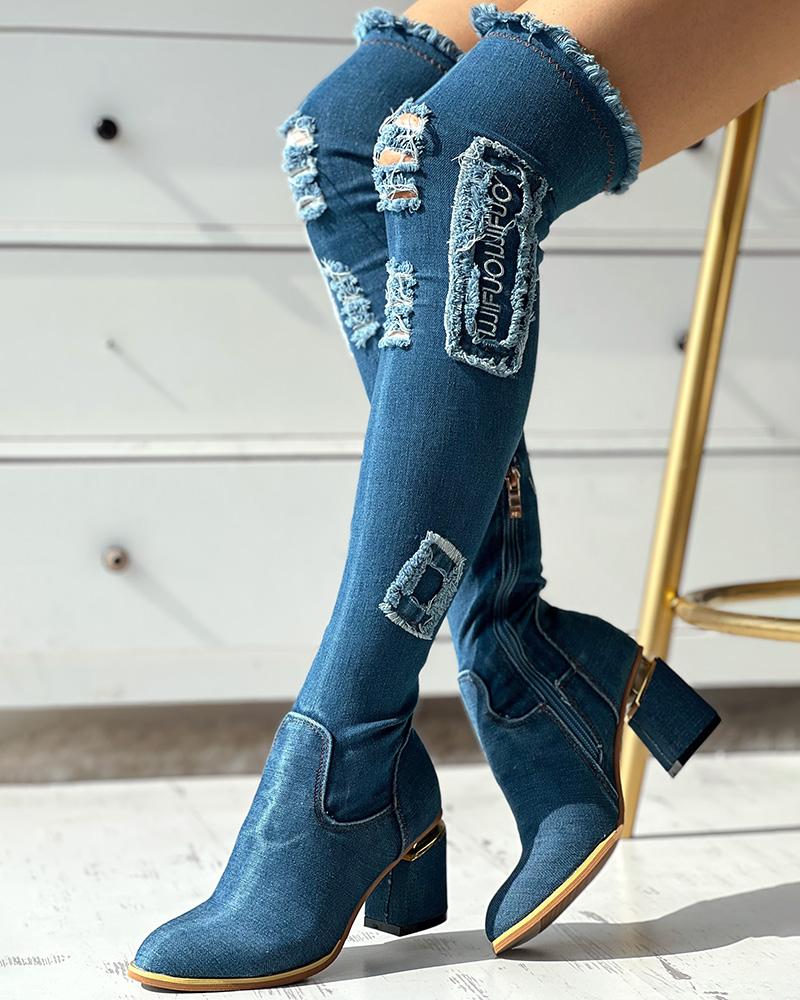 Fringe Hem Ripped Over The Knee Chunky Boots, Blue