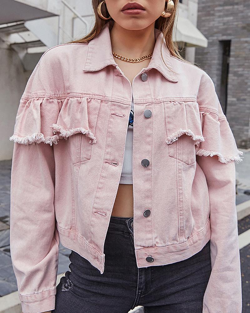 Fringe Hem Ruffles Button Front Denim Coat, Pink