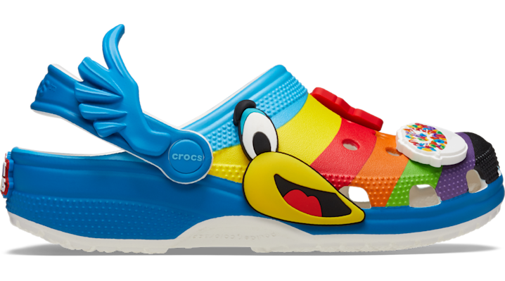 Toucan Sam® takes flight on this vibrant Froot Loops Classic Clog from the Kelloggs ® x Crocs collection. A brilliant rainbow print cascades down the front upper and features molded TPU character details like a toucan wing on the heel strap. The footbed is stamped with the Froot Loops logo and includes four exclusive Jibbitz™ charms. Froot Loops X Crocs Classic Clog Details: Incredibly light and fun to wear Water-friendly and buoyant; weighs only ounces Molded TPU toucan wing and face Ventilation ports add breathability and help shed water and debris Easy to clean and quick to dry Pivoting heel straps for a more secure fit Four exclusive Jibbitz™ charms Iconic Crocs Comfort™: Lightweight. Flexible. 360-degree comfort
