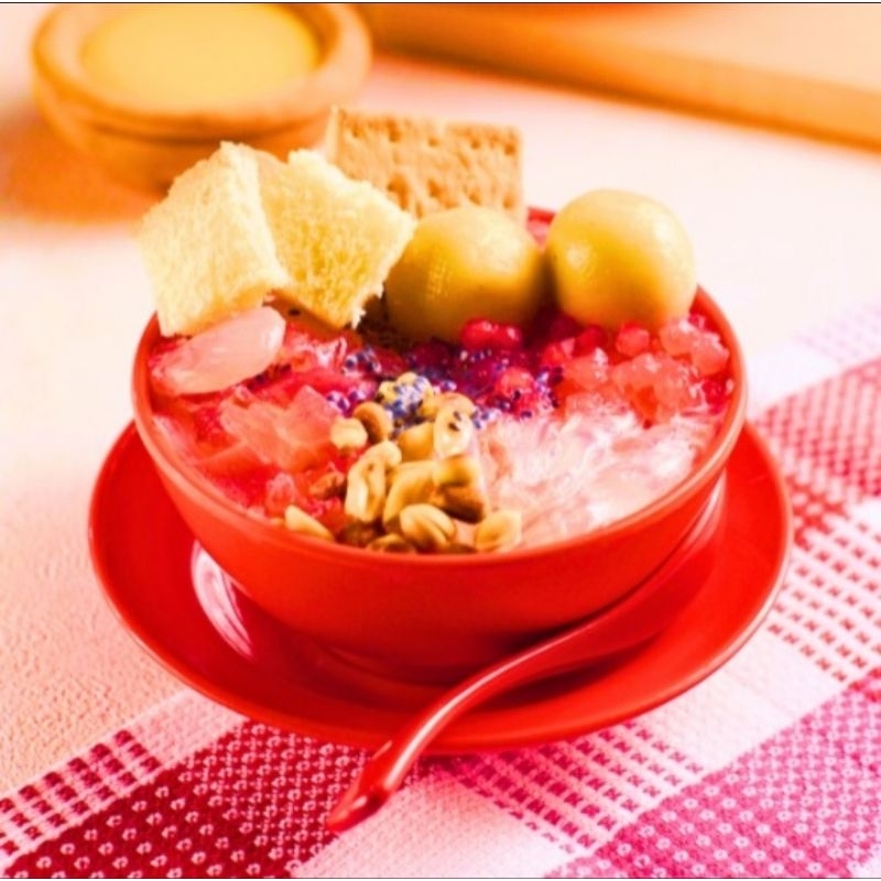 3. Sajikan dengan topping gabin, roti, kacang dan ronde susu siap disantap.