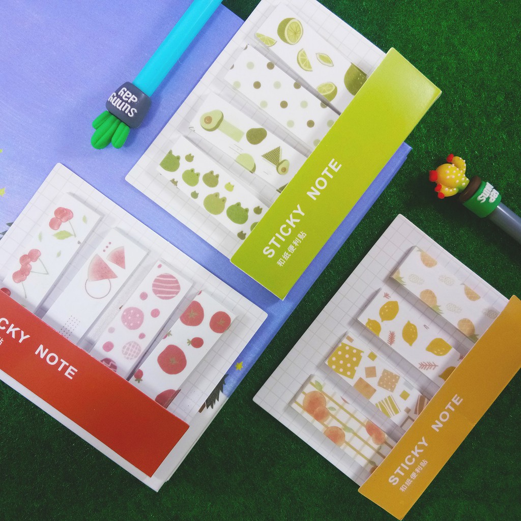 Mini memo set tempel berbahan kertas dengan variasi motif buah dalam 3 warna. Dapat digunakan untuk menulis catatan, menandai halaman, hiasan buku jurnal, dan sebagainya. Ukurannya yang mini memudahkannya untuk dibawa kemana pun.