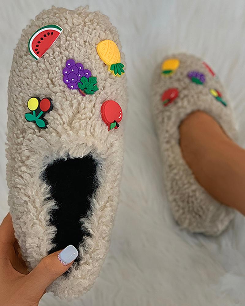Fruit Pattern Fluffy Shoes, Khaki