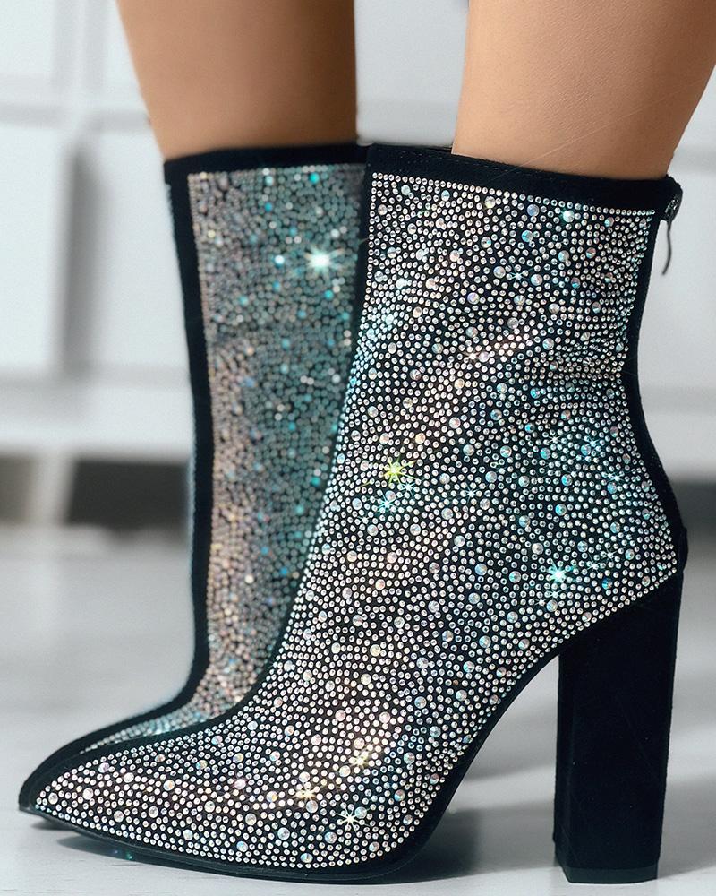 Full Rhinestone Contrast Piping Chunky Boots, Black