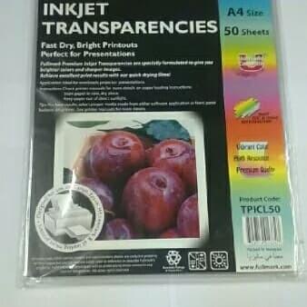 Transparan yang bisa diprint dengan printer inkjet. Biasa digunakan sebagai media presentasi. Isi 50 lembar/pack.