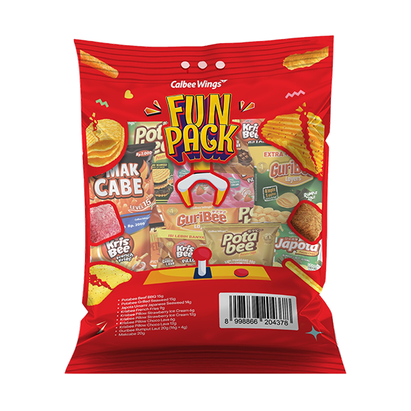 BARU! Fun Pack dari Calbee-Wings merupakan paket berisi 10 macam snack pilihan dengan berbagai varian raza yang lezat. Cocok dinikmati saat bersantai atau bersama teman dan keluarga, serta dapat dijadikan sebagai hadiah ulang tahun atau souvenir. Paket snack ini berisi: