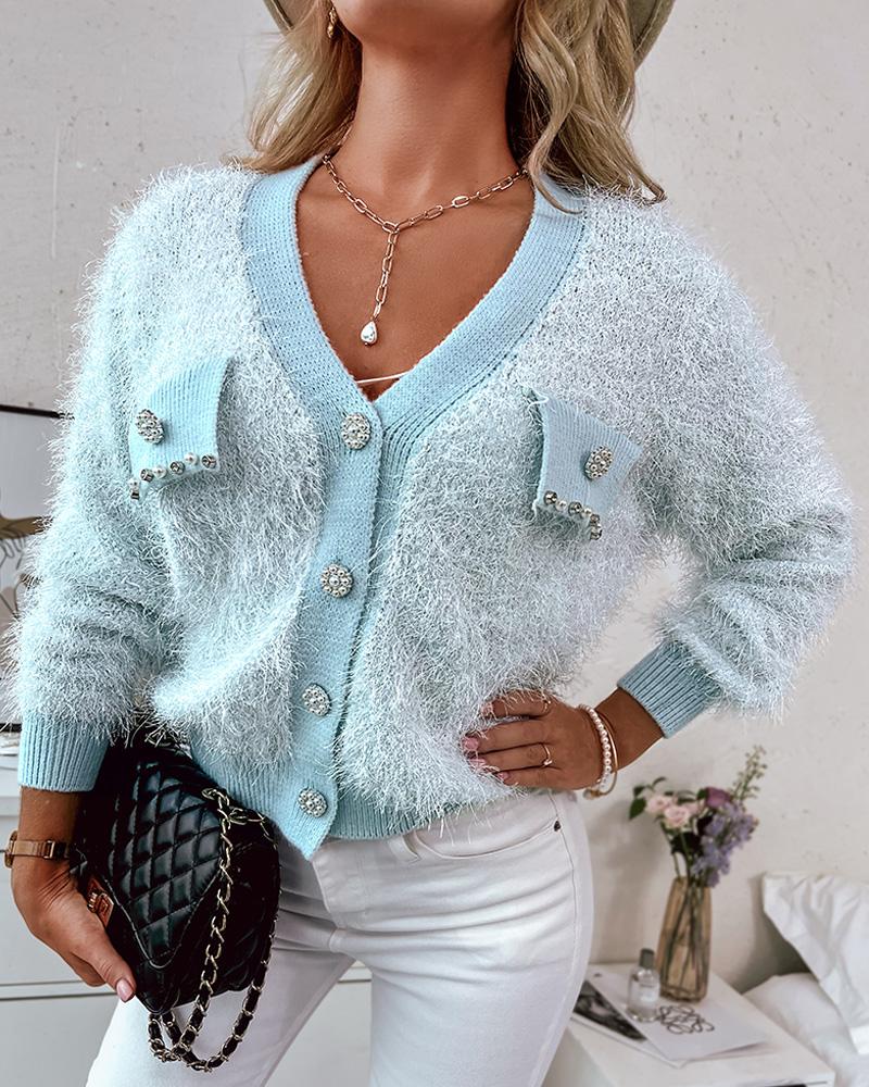 Fuzzy Buttoned Pearls Rhinestone Decor Cardigan, Blue