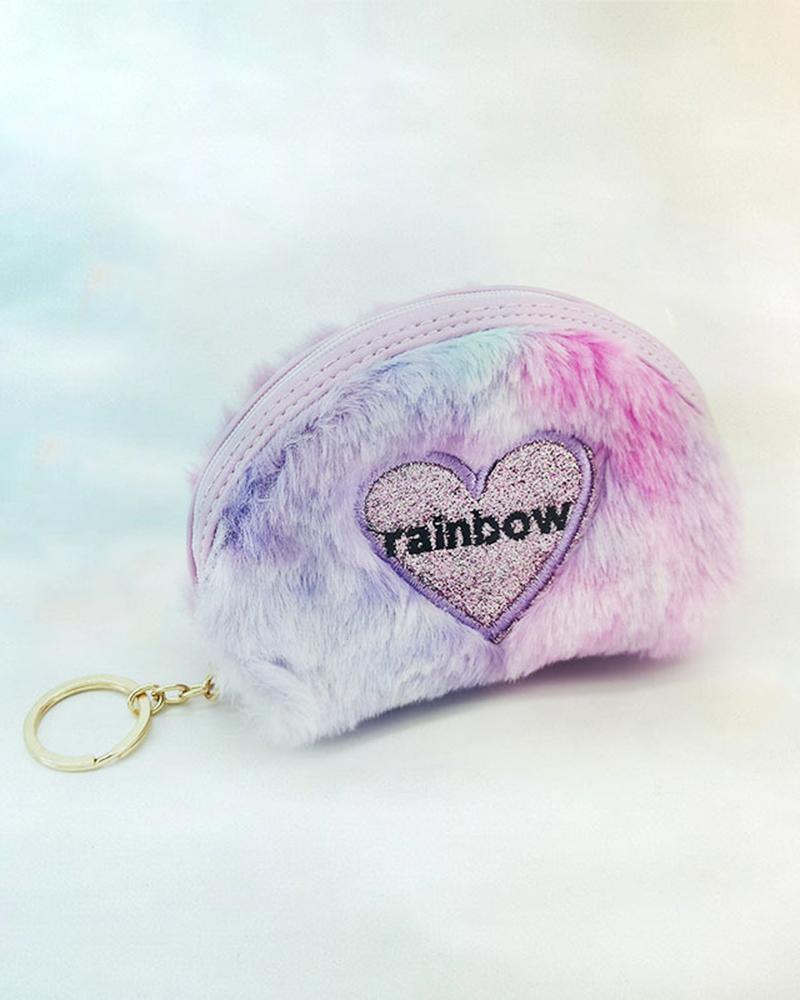 Fuzzy Heart Pattern Zipper Design Key Ring Bag, Purple