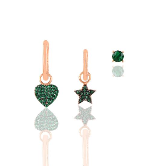 Gümüş rose yeşil taşlı yıldız, kalp ve tektaşlı kombin küpe