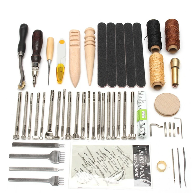G1 59 PCS Leather Craft Hand Tools Kit Thread Awl Waxed Thimble Kit For Hand Stitching Sewing Stamping Leathercraft Tool Set