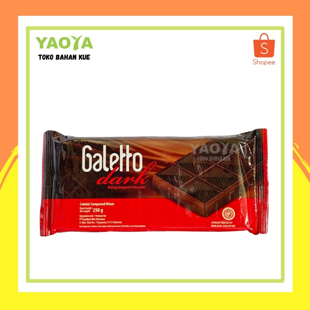 Galetto dark compound chocolate merupakan cokelat masak yang siap diolah ataupun dapat langsung dimakan. Diformulasikan untuk penanganan cokelat yang mudah. Cocok untuk hiasan kue, dicetak, diserut, isian kue dan lain – lain