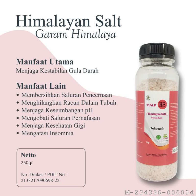 Garam Himalaya / Himalayan Salt ============================ Garam Himalaya tidak sembarangan bisa Anda dapatkan. Garam ini bukan berasal dari laut seperti garam biasa, tetapi garam ini berasal dari tambang garam terbesar kedua di dunia yang bernama Khewra Salt Mine yang berada di kaki pegunungan Himalaya, Pakistan. Beberapa manfaat yang bisa Anda dapatkan dari konsumsi garam Himalaya adalah: ✅ Mengandung banyak mineral ✅ Mengandung antimikroba ✅ Mempertahankan hidrasi tubuh ✅ Menyeimbangkan pH tubuh ✅ Detoksifikasi Komposisi : Garam Himalaya Murni 100% Isi : 250gram ========