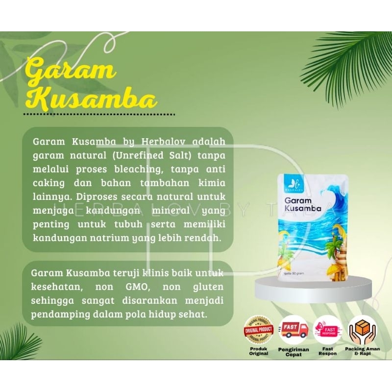 garam Kusamba by Herbalov adalah garam natural tanpa melalui proses bleaching tanpa anti caking dan tambahan bahan kimia lainnya. diproses secara natural untuk menjaga kandungan mineral yang penting untuk tubuh serta memiliki kandungan natrium yang lebih rendah.