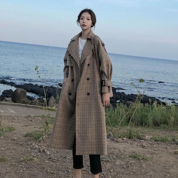 korean ladies plaid trench coat for women double breasted belted oversize loose women duster coat outerwear with storm flaps, Tan;black