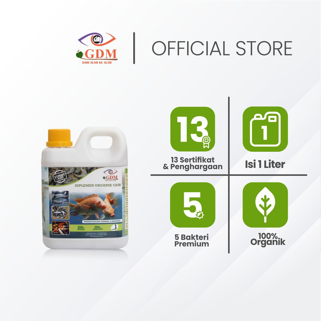 Merupakan suplemen organik cair yang mengandung unsur mineral yang dibutuhkan ikan dan udang serta bakteri apatogen yang sangat menguntungkan bagi pertumbuhan barbagai jenis ikan.GDM Perikanan dapat memperbaiki kualitas air kolam, meningkatkan jumlah keanekaragaman plankton, serta meningkatkan kekebalan/antibodi ikan dan udang.GDM perikanan sangat cocok digunakan untuk berbagai jenis ikan seperti :• bandeng• lele• patin• gurami• nila• mas• koi• arwana• belut• dllUdang seperti :• vaname• windu• galah• dan lobster air tawar.Untuk hasil terbaik silakan kombinasikan dengan GDM Black BOS (Bio Organic Stimulant) dan Granule Bio Organik GDM SAME.Bahan-Bahan Produk GDM Organik• Limbah Organik• Rumput Laut• Minyak Hewani• Algae• BakteriBahan-bahan yang digunakan dalam proses pembuatan produk GDM Organik merupakan bahan-bahan pilihan, sehingga dapat menjamin kualitasnya.Semua bahanya yang digunakan merupakan bahan yang “segar”, artinya bahan baku didapatkan setiap harinya dan langsung diproses. Sehingga tidak terjadi proses pembusukan yang memicu masuknya sumber-sumber penyakit.Formulasi Kandungan Bakteri Kami Adalah Yang Terbaik:• Bacillus brevis• Bacillus pumillus• Bacillus mycoides• Pseudomonas alcaligenes• Micrococcus roseus.Untuk Detail Manfaat bakteri bisa cek di photo produk yang terlampir.Setiap pembelian GDM, Akan dipandu langsung oleh tim ahli GDM mengenai cara penggunaan dan berbagai permasalah seputar agrobisnis.Bersama GDM Siapapun Bisa Panen.Nb: Kemasan 1Liter