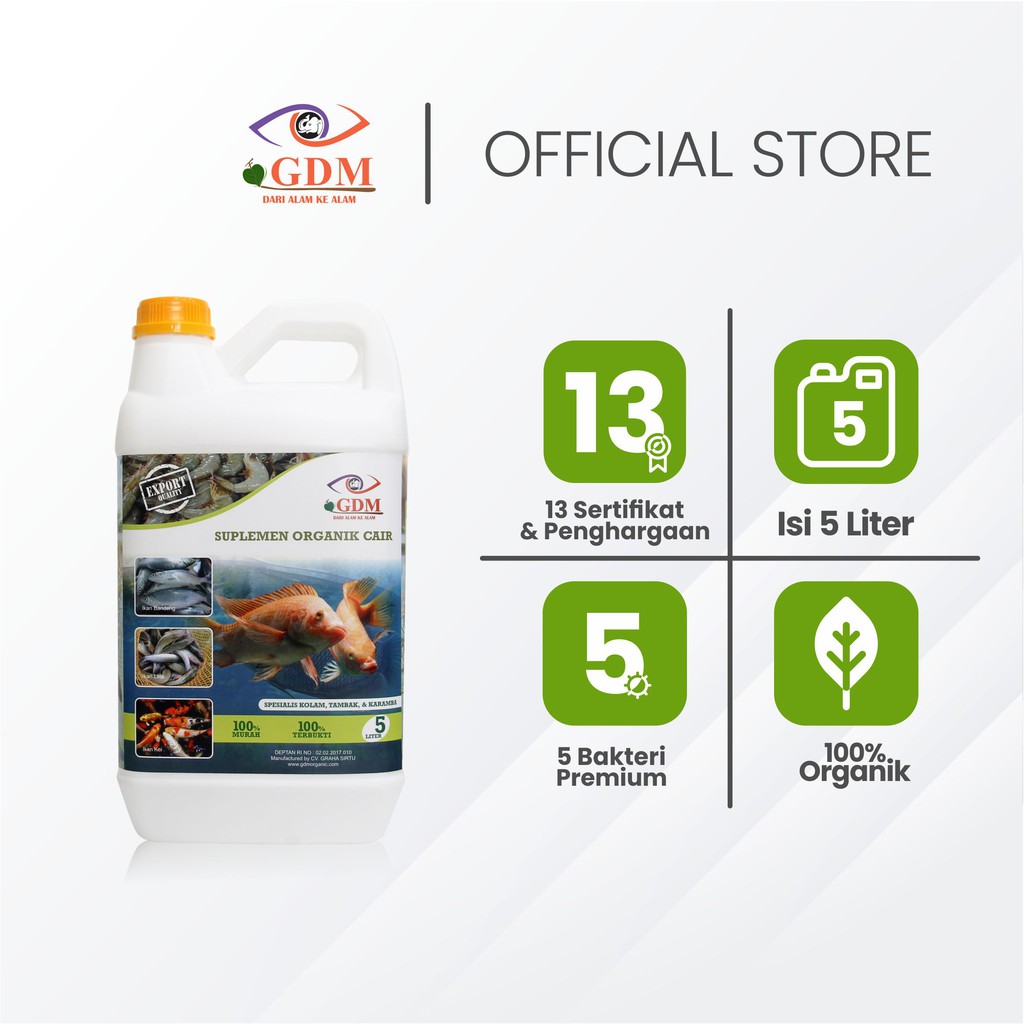Merupakan suplemen organik cair yang mengandung unsur mineral yang dibutuhkan ikan dan udang serta bakteri apatogen yang sangat menguntungkan bagi pertumbuhan barbagai jenis ikan.GDM Perikanan dapat memperbaiki kualitas air kolam, meningkatkan jumlah keanekaragaman plankton, serta meningkatkan kekebalan/antibodi ikan dan udang.GDM perikanan sangat cocok digunakan untuk berbagai jenis ikan seperti :• bandeng• lele• patin• gurami• nila• mas• koi• arwana• belut• dllUdang seperti :• vaname• windu• galah• dan lobster air tawar.Untuk hasil terbaik silakan kombinasikan dengan GDM Black BOS (Bio Organic Stimulant) dan Granule Bio Organik GDM SAME.Bahan-Bahan Produk GDM Organik• Limbah Organik• Rumput Laut• Minyak Hewani• Algae• BakteriBahan-bahan yang digunakan dalam proses pembuatan produk GDM Organik merupakan bahan-bahan pilihan, sehingga dapat menjamin kualitasnya.Semua bahanya yang digunakan merupakan bahan yang “segar”, artinya bahan baku didapatkan setiap harinya dan langsung diproses. Sehingga tidak terjadi proses pembusukan yang memicu masuknya sumber-sumber penyakit.Formulasi Kandungan Bakteri Kami Adalah Yang Terbaik:• Bacillus brevis• Bacillus pumillus• Bacillus mycoides• Pseudomonas alcaligenes• Micrococcus roseus.Untuk Detail Manfaat bakteri bisa cek di photo produk yang terlampir.Setiap pembelian GDM, Akan dipandu langsung oleh tim ahli GDM mengenai cara penggunaan dan berbagai permasalah seputar agrobisnis.Bersama GDM Siapapun Bisa Panen.Nb: Kemasan 5Liter