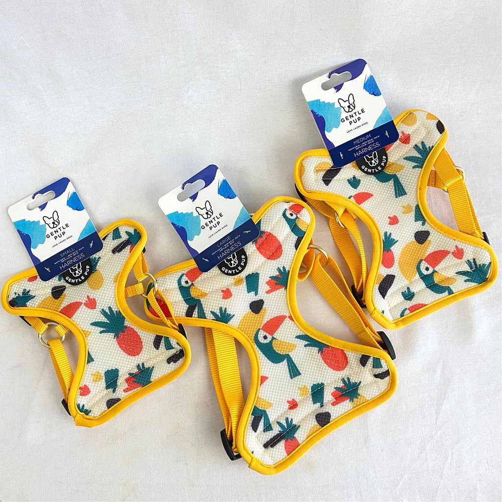 The Gentle Pup Harness is true to its namesake—an easy-slip-on-and-off harness that’s fully adjustable, with soft, knit edging and a cooling mesh inset for your pup’s ultimate comfort. Features webbing straps for easy wearing and buckles with secure snap closure. Perfect for dress down days, special events, and everything in between.Our products are meticulously achieved using innovative heat transfer technology, a process that digitally prints high-resolution images onto a fabric with seamless accuracy. This ensures your favourite patterns and colours really pop!SKIN FRIENDLY. FUR FRIENDLIER.Stay worry-free. The heat transfer process is completely safe for dogs, with no irritation or itching.LONG-LASTING WEAROur prints withstand even the most rigorous play. No cracking or fading—so you stay fashionable even when your dog gets down and dirty.THE HOTTEST PRINTS AROUNDWith superb colour quality and fun prints, you’re completely spoilt for choice when it comes to picking just one. Don’t limit yourself—get a style for every occasion!WATER RESISTANT. WEATHER RESILIENT.Every product is designed with super sturdy polyester, perfect for both indoor and outdoor fun. They are also incredibly easy to clean with water—simply wipe down to remove any dirt or grime and all’s good.--------------------Small – Neck : 34 cm - 39 cm / Width : 1 cm / Girth : 37 cm – 47 cmMedium – Neck : 42 cm - 50 cm / Width : 1.5 cm / Girth : 44 cm – 57 cmLarge – Neck : 50 -57 cm / Width : 2 cm / Girth : 55 cm – 76 cm