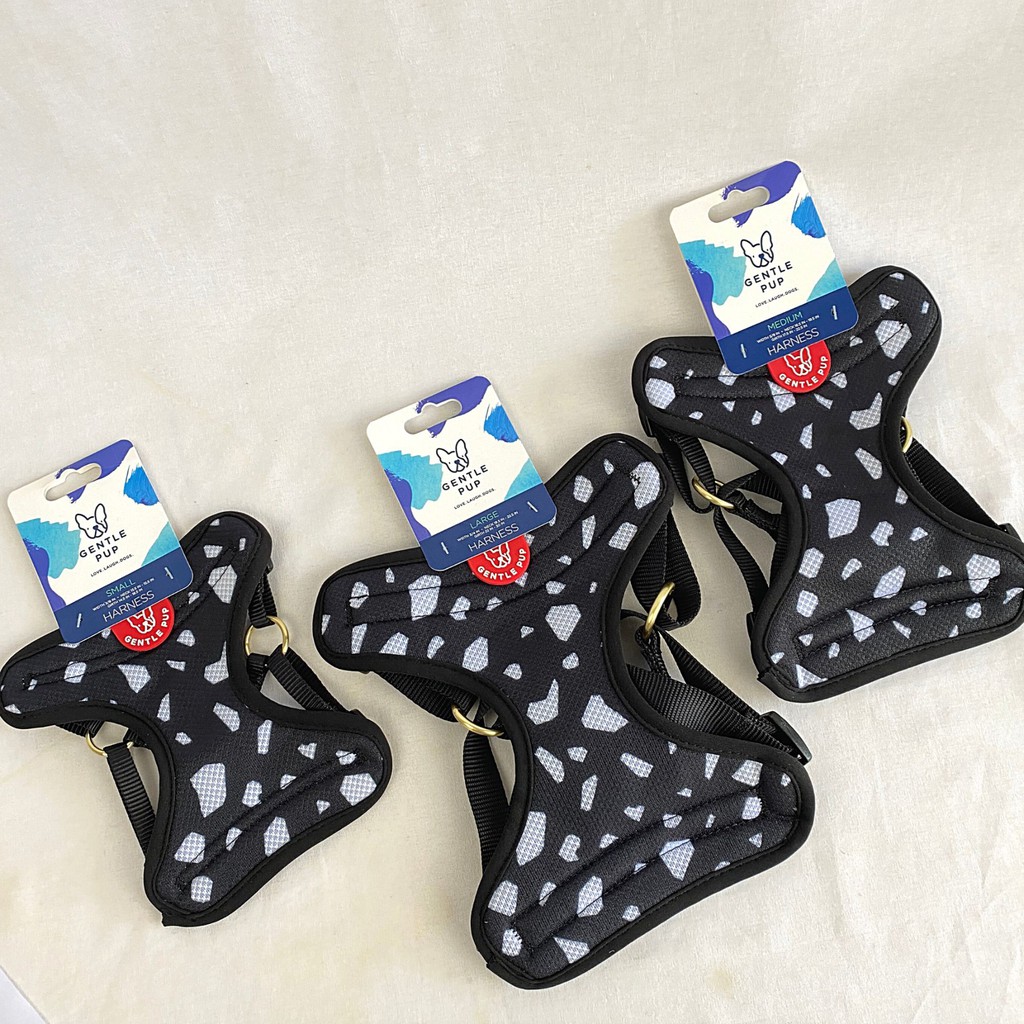 The Gentle Pup Harness is true to its namesake—an easy-slip-on-and-off harness that’s fully adjustable, with soft, knit edging and a cooling mesh inset for your pup’s ultimate comfort. Features webbing straps for easy wearing and buckles with secure snap closure. Perfect for dress down days, special events, and everything in between.Our products are meticulously achieved using innovative heat transfer technology, a process that digitally prints high-resolution images onto a fabric with seamless accuracy. This ensures your favourite patterns and colours really pop!SKIN FRIENDLY. FUR FRIENDLIER.Stay worry-free. The heat transfer process is completely safe for dogs, with no irritation or itching.LONG-LASTING WEAROur prints withstand even the most rigorous play. No cracking or fading—so you stay fashionable even when your dog gets down and dirty.THE HOTTEST PRINTS AROUNDWith superb colour quality and fun prints, you’re completely spoilt for choice when it comes to picking just one. Don’t limit yourself—get a style for every occasion!WATER RESISTANT. WEATHER RESILIENT.Every product is designed with super sturdy polyester, perfect for both indoor and outdoor fun. They are also incredibly easy to clean with water—simply wipe down to remove any dirt or grime and all’s good.--------------------Small – Neck : 34 cm - 39 cm / Width : 1 cm / Girth : 37 cm – 47 cmMedium – Neck : 42 cm - 50 cm / Width : 1.5 cm / Girth : 44 cm – 57 cmLarge – Neck : 50 -57 cm / Width : 2 cm / Girth : 55 cm – 76 cm