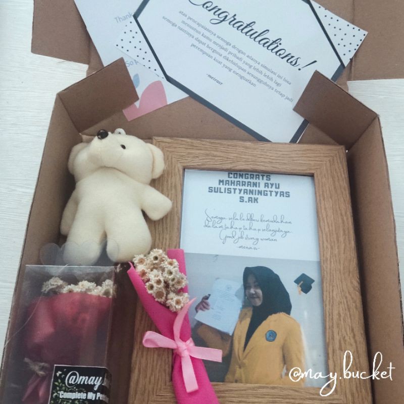 ✨60k (include box + perlengkapan, frame flower, mini buket in box 15k, kartu ucapan, boneka mini)