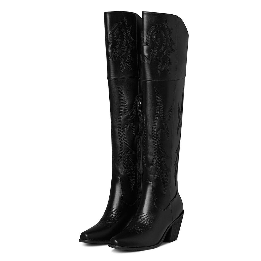 GIGIFOX Вышитые женские сапоги выше колена в стиле вестерн с острым носком и боковой молнией на массивном высоком каблуке, модные сапоги для отдыха 9.5