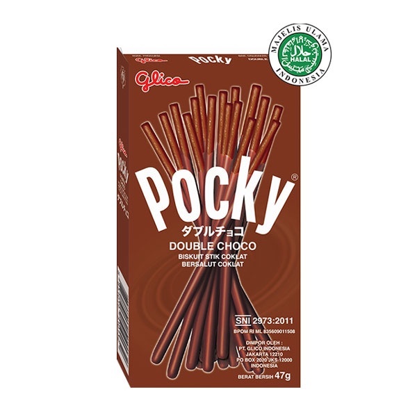 Nikmatnya kelezatan Pocky Double Choco! Kenikmatan double dari biskuit stik coklat berlapis krim coklat tebal yang enak, praktis, dan ngga berantakan.