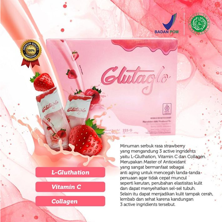 Minuman serbuk collagen rasa strawberry bermanfaat sebagai anti aging, untuk mencegah tanda penuaan dini , dan mencerahkan kulit.