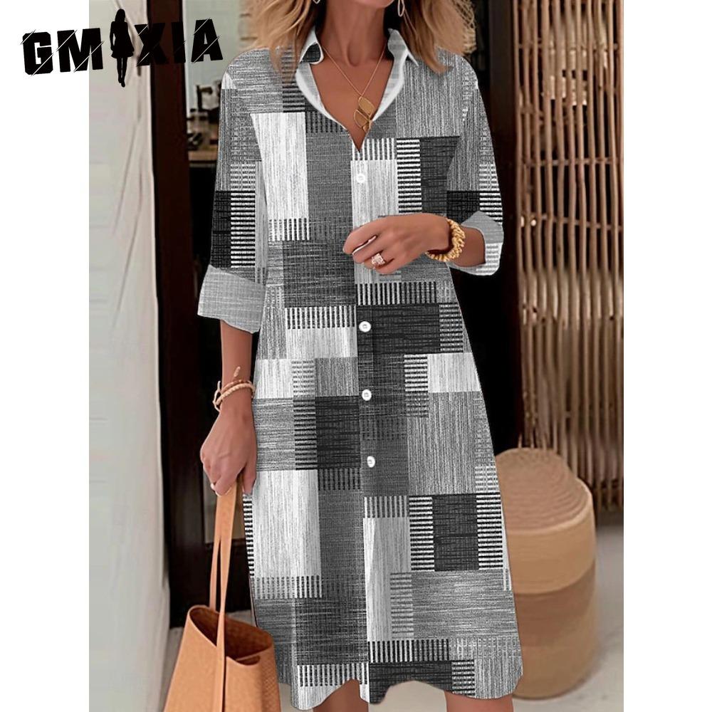 GMXIA Женская Мода Весна Осень Цветной Блок Принт Длинный Рукав Воротник Поло Свободная Талия Повседневные Платья XL