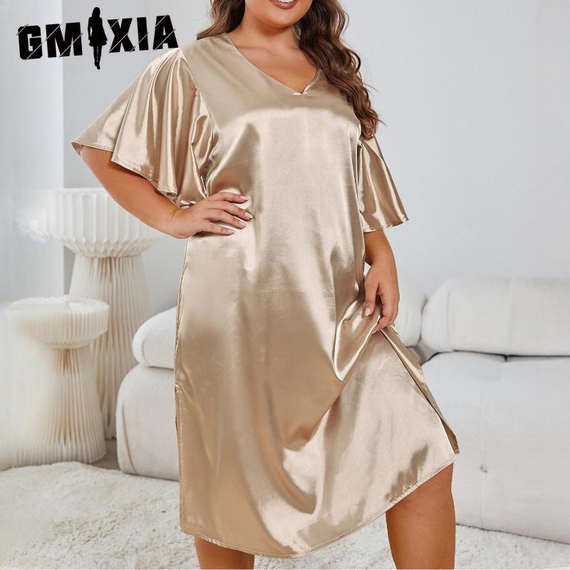 GMXIA Женская летняя пижама большого размера из ледяного шелка, свободные ночные рубашки большого размера XXXXL золотистый