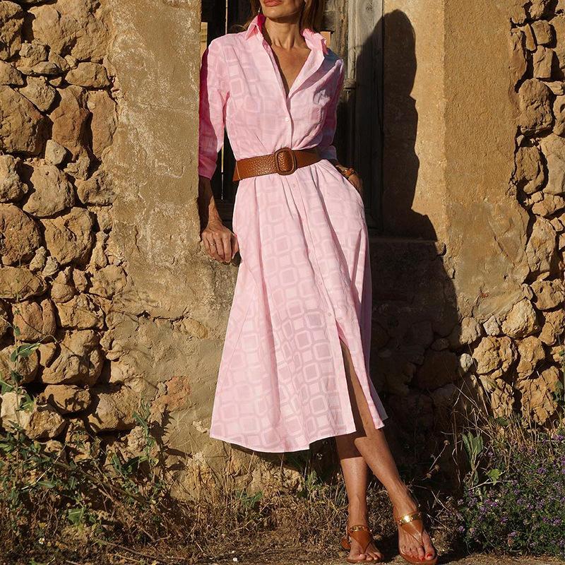 GMXIA Женская мода весна осень однотонный принт длинный рукав поло воротник высокая талия повседневные платья XL розовый