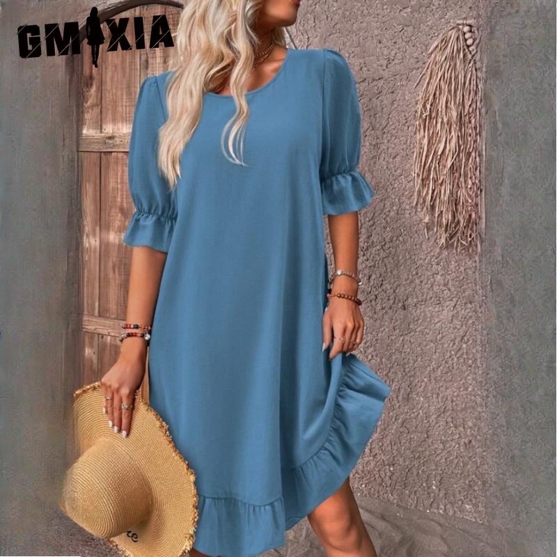 GMXIA Женские Модные Летние Весенние Однотонные Платья с Принтом, Круглый Вырез, Завышенная Талия, Повседневные XXL павлин голубой