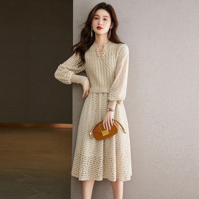 GMXIA Женские трикотажные платья Осень и зима Новые модные длинные платья-свитера с рукавами-фонариками One size бежевый