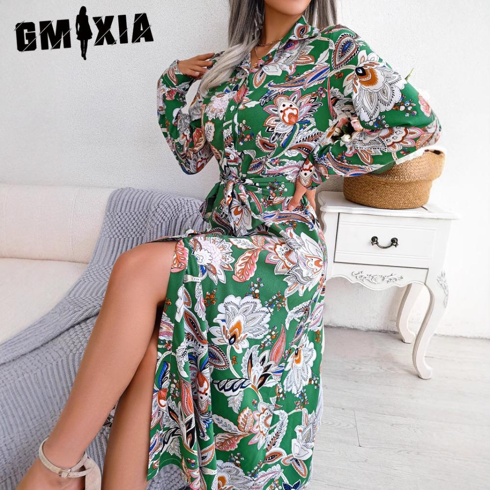 GMXIA Женское платье-рубашка с длинным рукавом и цветочным воротником в стиле ретро на весну-лето XL зелёный