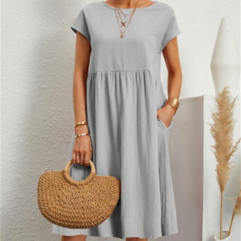 GMXIA Мода Летний Темперамент Женское Хлопково-Льняное Платье с Круглым Вырезом А-силуэта Большого Размера Свободные Платья L серый