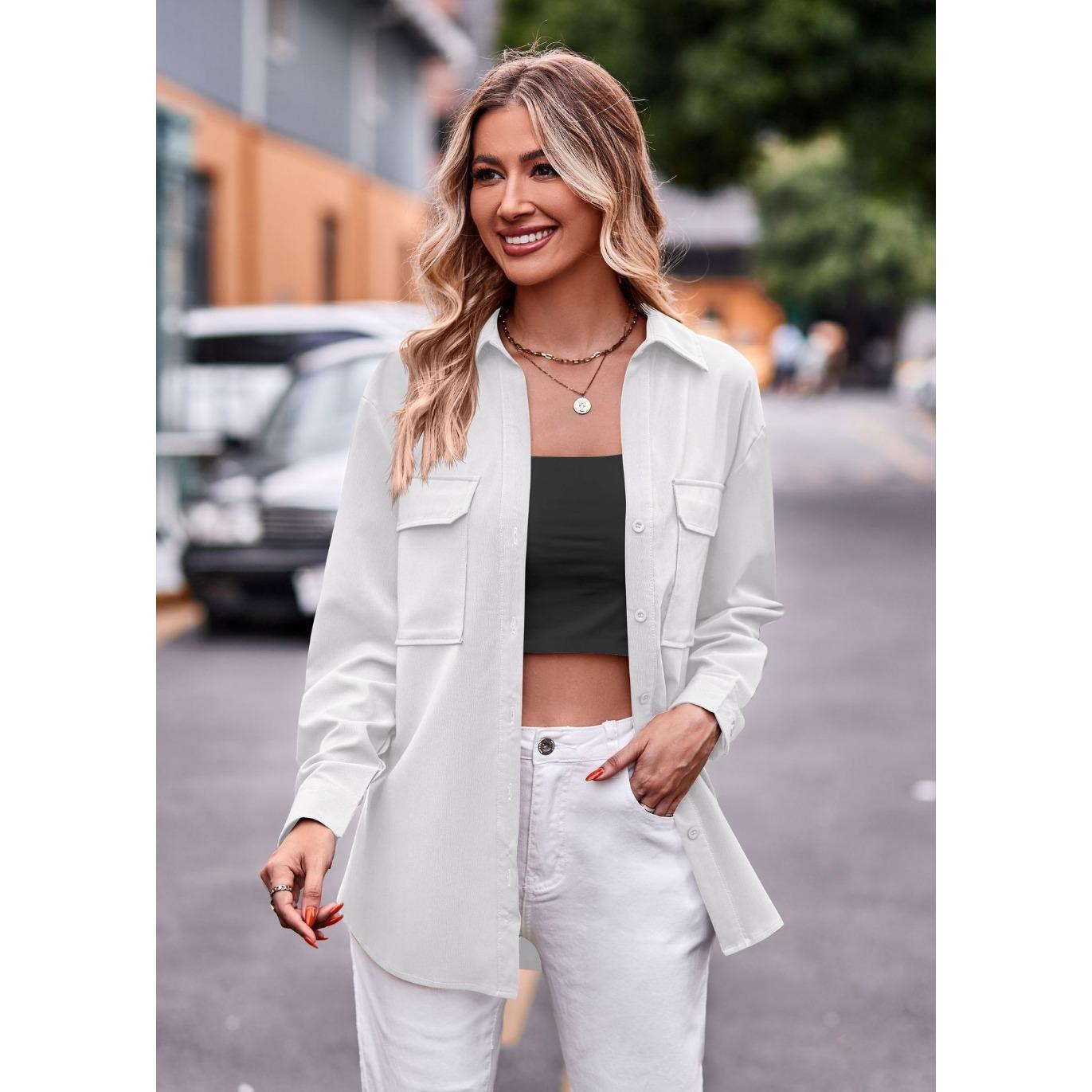 GMXIA женские винтажные повседневные однотонные куртки и пальто с воротником-поло на осень-зиму с длинным рукавом и принтом XXL белый