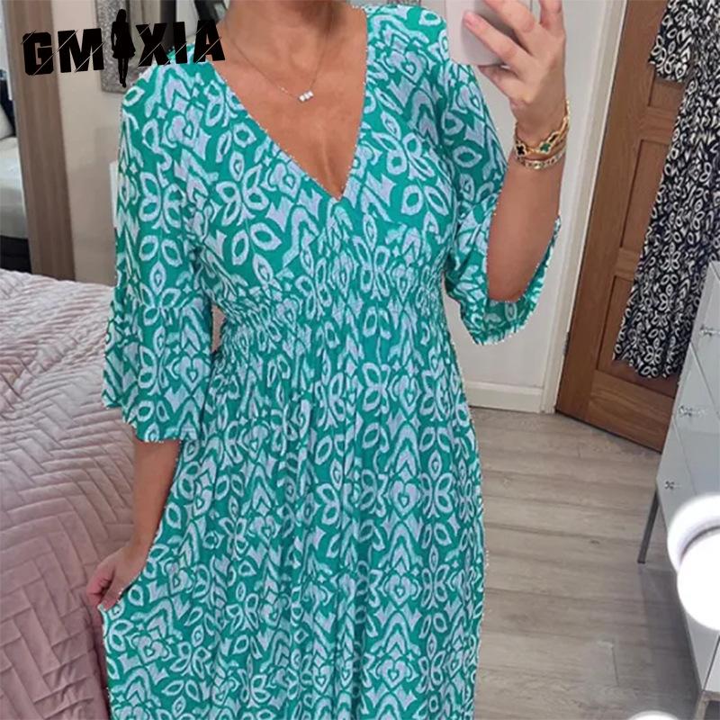 GMXIA женское модное повседневное платье большого размера с цветочным принтом и рукавами 1/2 с v-образным вырезом, свободное пляжное праздничное платье, платья