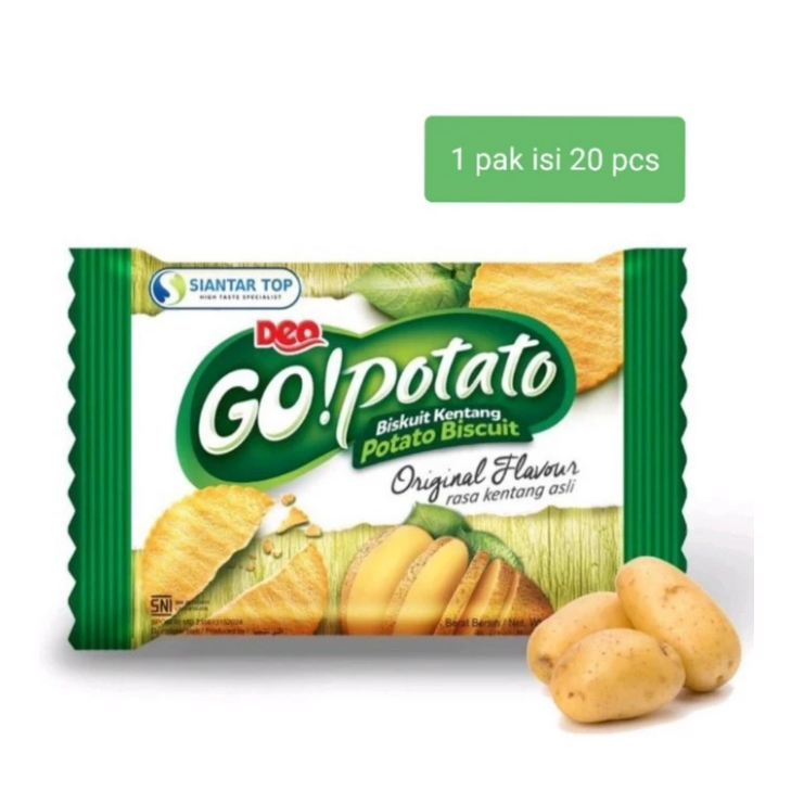 Go Potato Renceng Biskuit Kentang Rasa Original. Biskuit kentang pertama di Indonesia, dengan rasa yang sangat gurih dan renyah, sangat cocok untuk teman cemilan anda dirumah. Diproduksi Oleh : PT. Siantar Top